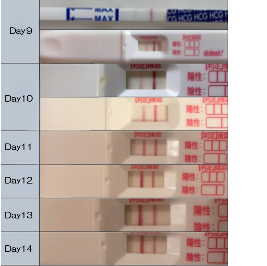 この記事では、妊娠した周期の高温期9〜14日目のフライング検査の記録を、実際の妊娠検査薬の写真とともにまとめています。